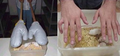 Imposição de mãos nos grupos "Controle-Luva" e "Impostação", respectivamente (imagens retiradas do mestrado de Monezi)